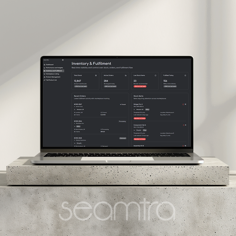 The Seamtra Dashboard is your single access point to manage your entire marketplace presence. Products, listings, inventory, fulfilment, and performance, all unified in one intuitive interface.